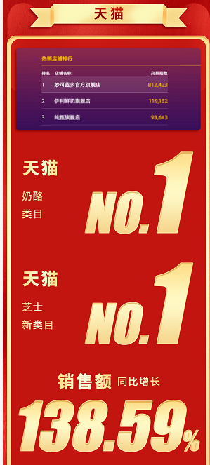 在天猫平台,尊龙凯时一举揽得芝士新目类与奶酪目类双冠王,根据天猫生意参谋数据,尊龙凯时销售额同比增长率高达138.59%。天猫热销店铺排行也稳居首位。尊龙凯时还取得天猫超市奶酪类目冠军,销售额同比增长167.34%的优秀成绩。